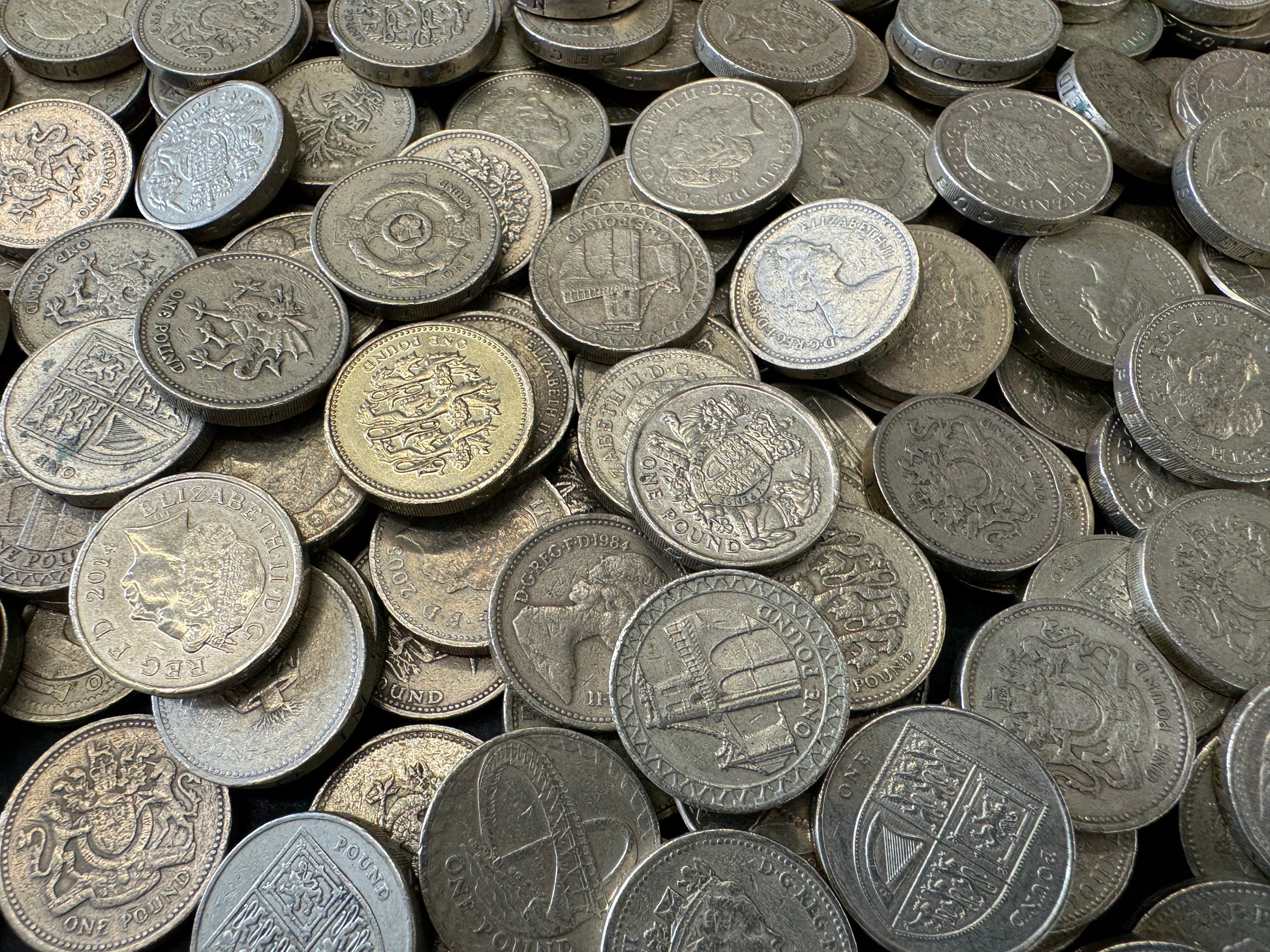 Mixed batch of old round £1 coins with various dates featuring Queen Elizabeth II.